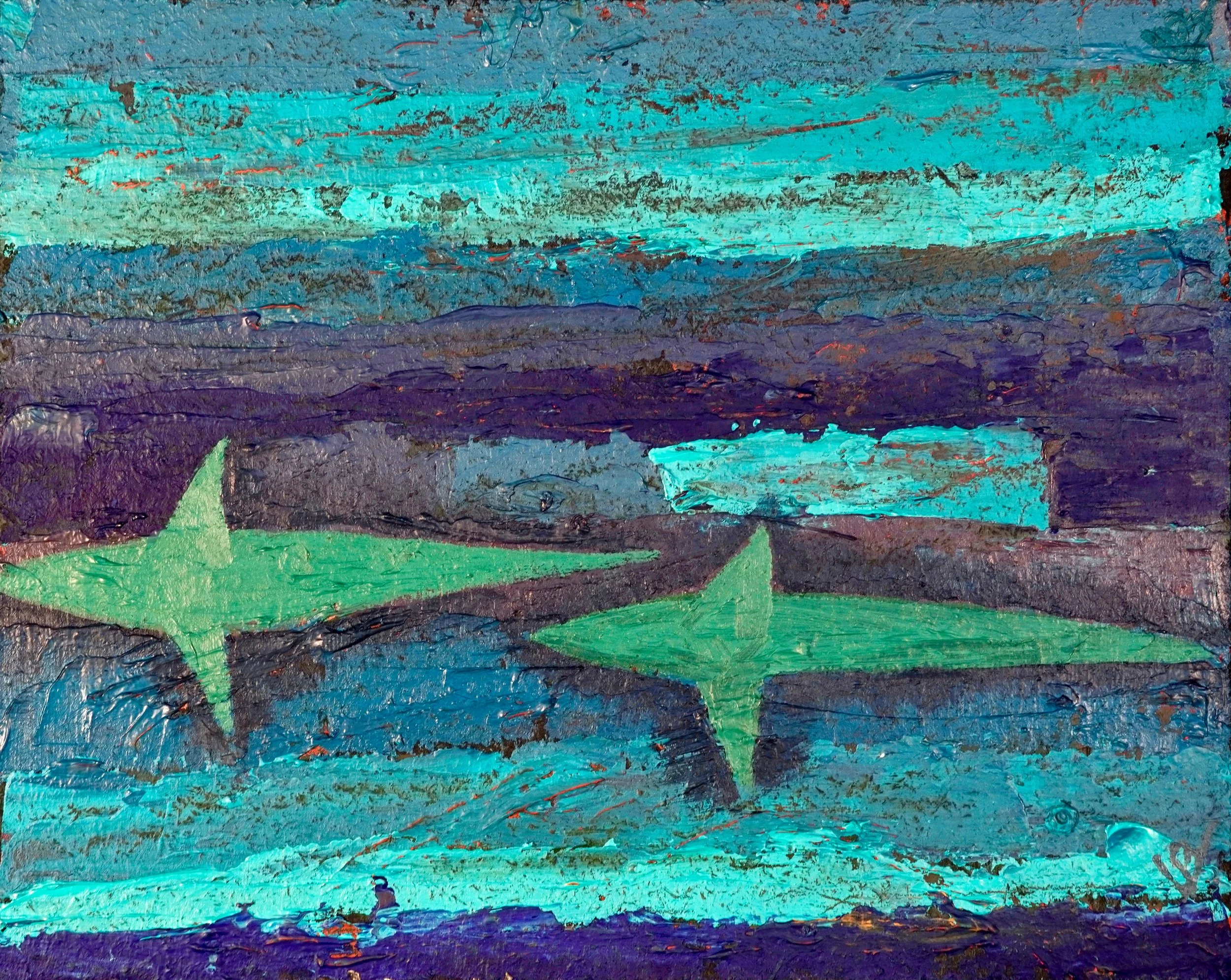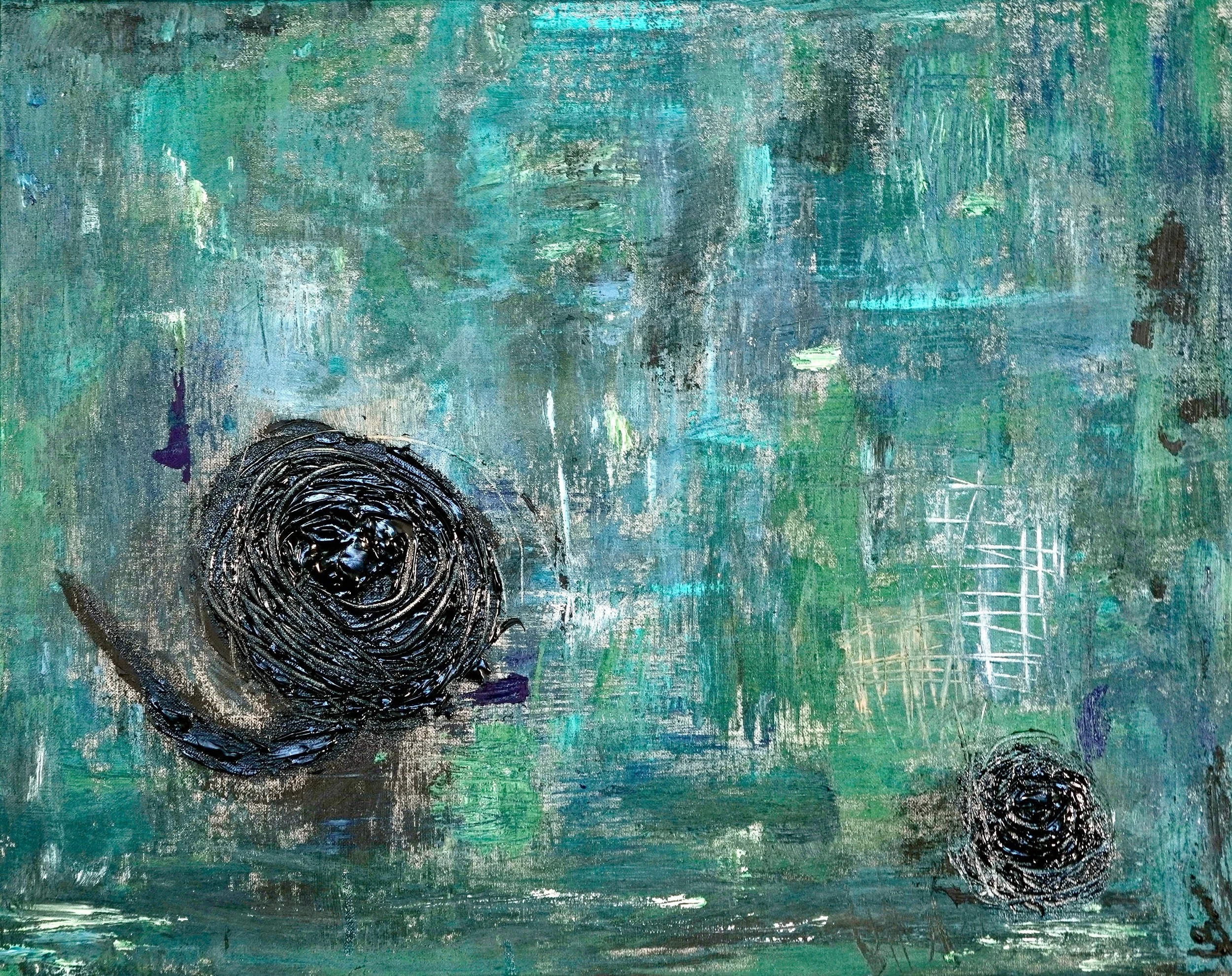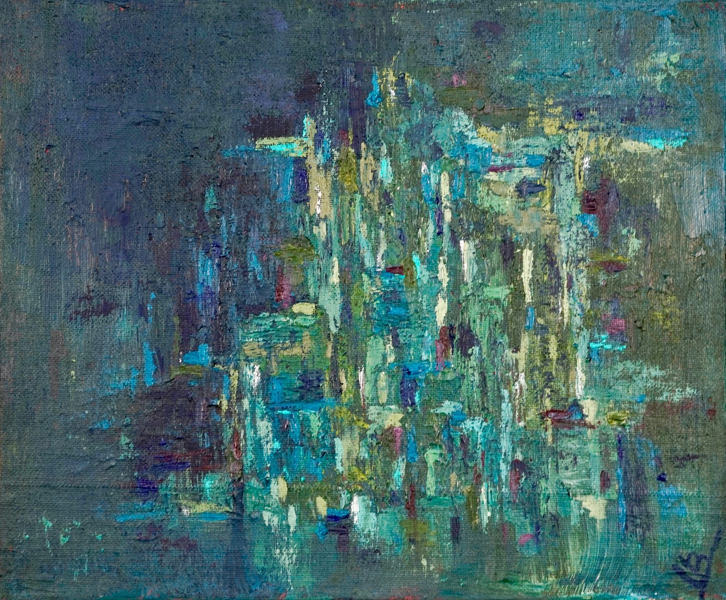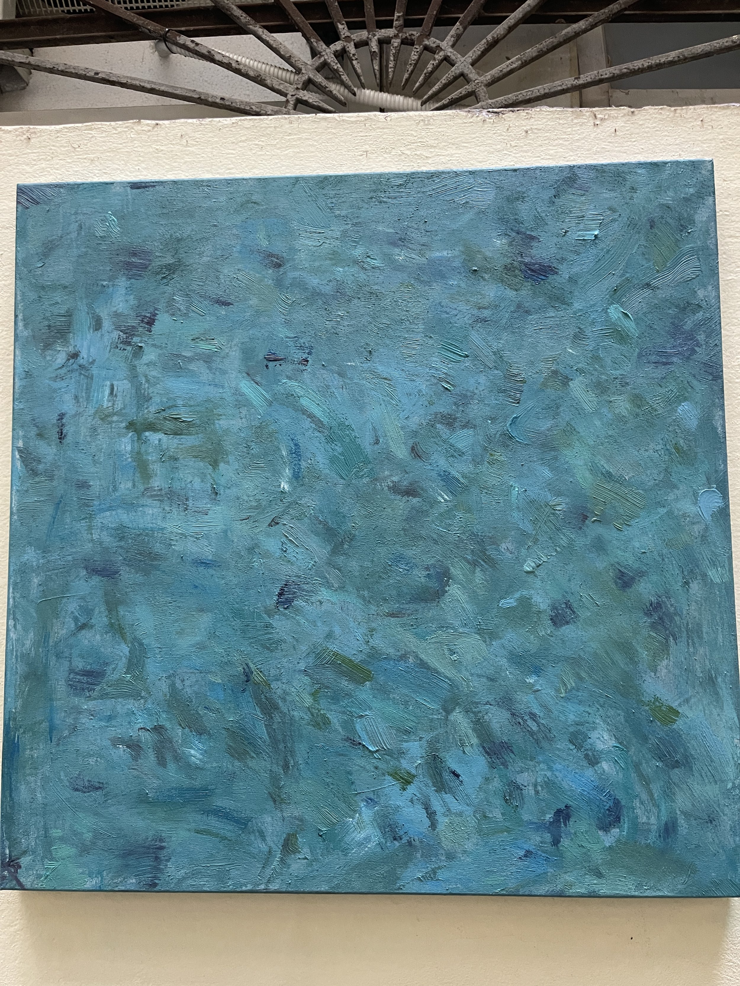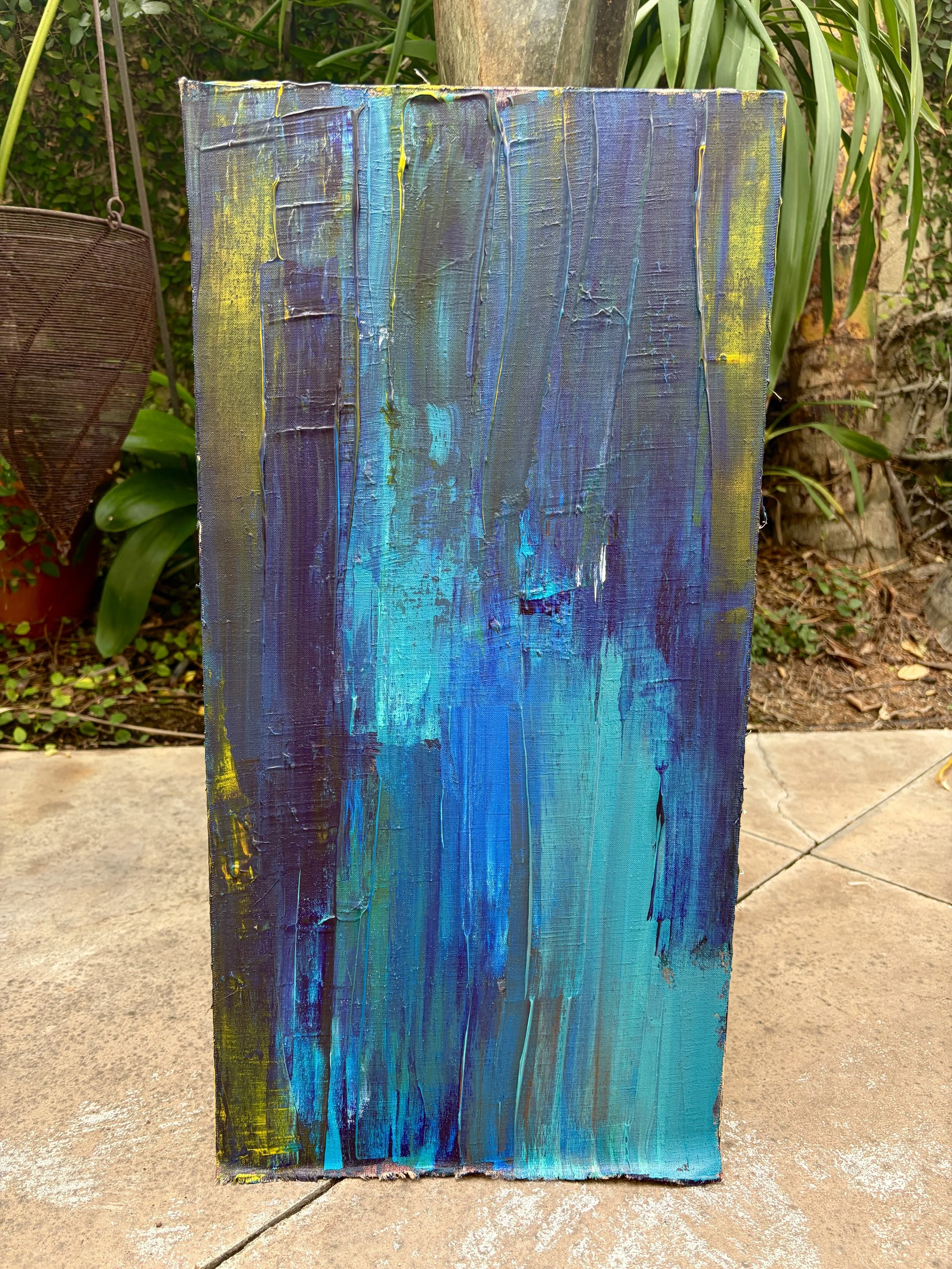 This is my second painting. I had something very different in mind but as the first coat of paint trickled down the canvas in streaks of blues, i followed my instinct and let my tools guide me. Painted horizontally, it looks great hung vertically and reminds a bit of monet, an unintentional result of my open hearted journey.
