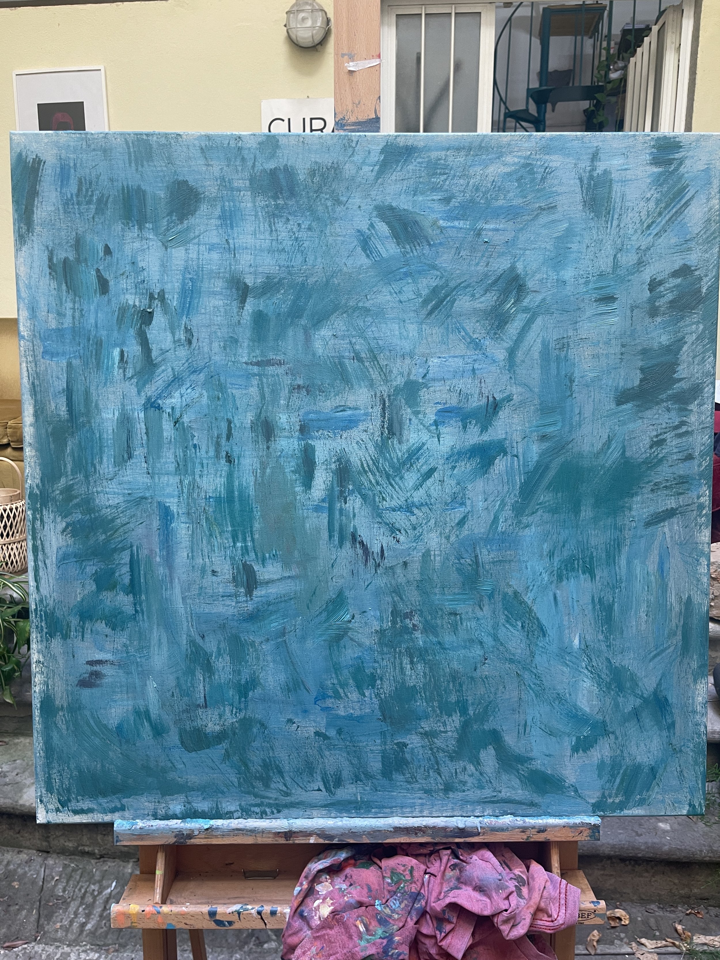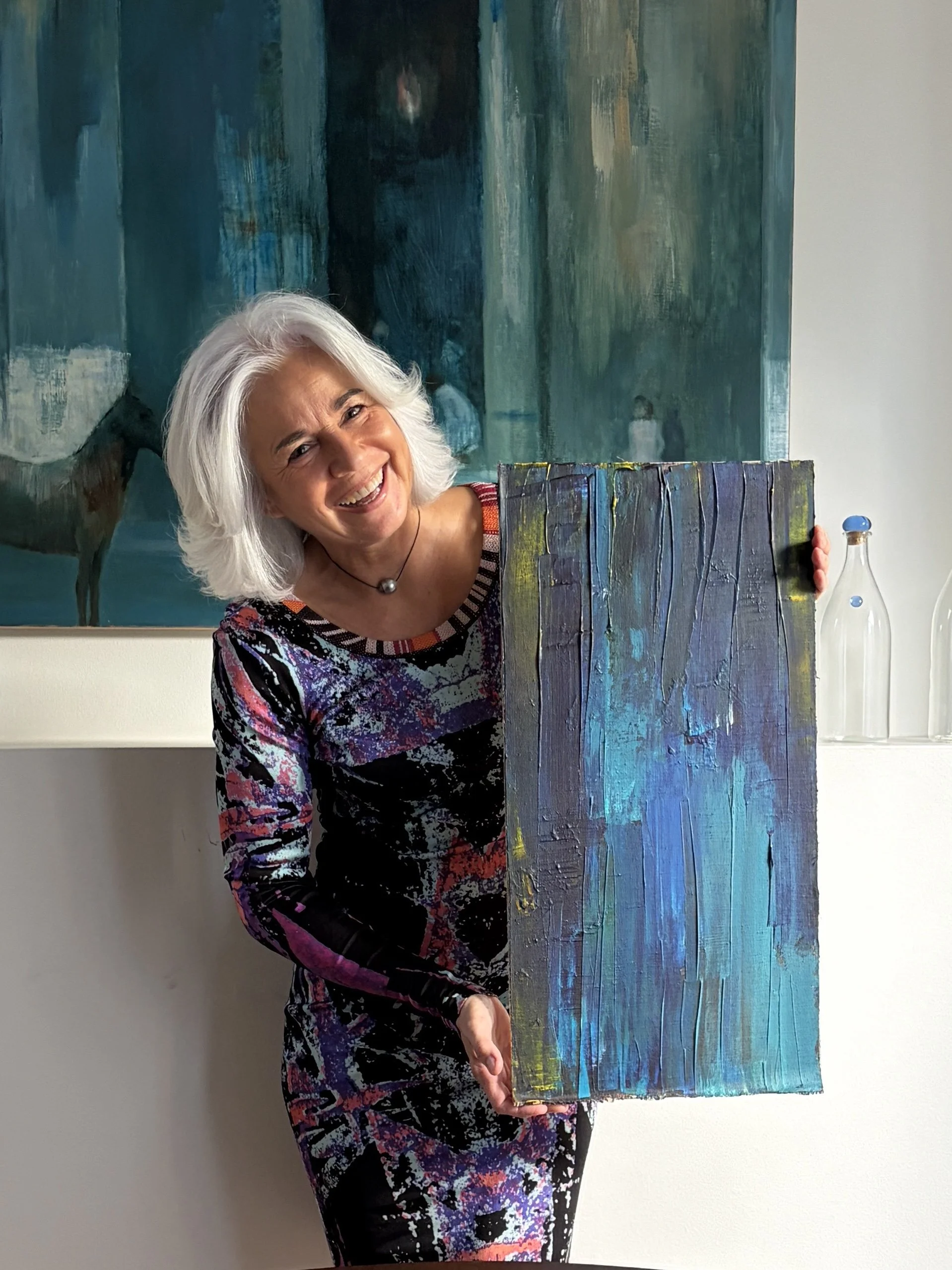 Linen glued on wood. Underneath the stripes is another unfinished painting from years ago. The beauty about acrylics is that you can paint layer after layer if you dont like a result. I had left over paint on my palette and wanted to finish it up. I took my straight wide spatula, dipped it richly in the leftover acrylic and ran it down the canvas. It accidentally created lines with the edge of the spatula which gives it character. The leftover paints mixed naturally into interesting hues of blues and yellows.