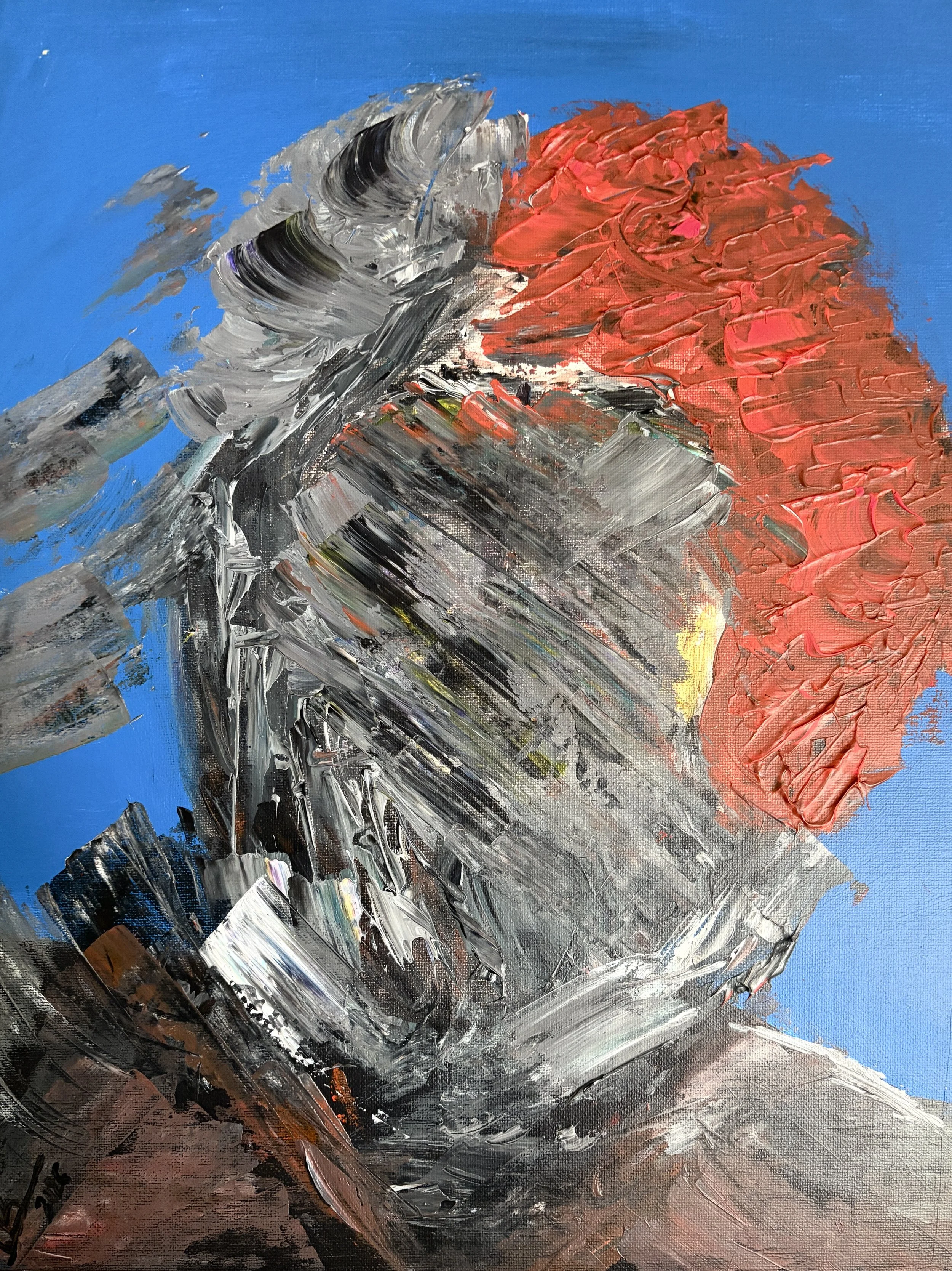 This painting was an awkward face, half real, half abstract. I worked on it to improve it and give it quality but it did not blossom. Eventually i covered the face with paint on a large spatula and broad strokes. As it became head with no face it instantly reminded me of the silhouette of beethoven, hence the title. A fun journey.