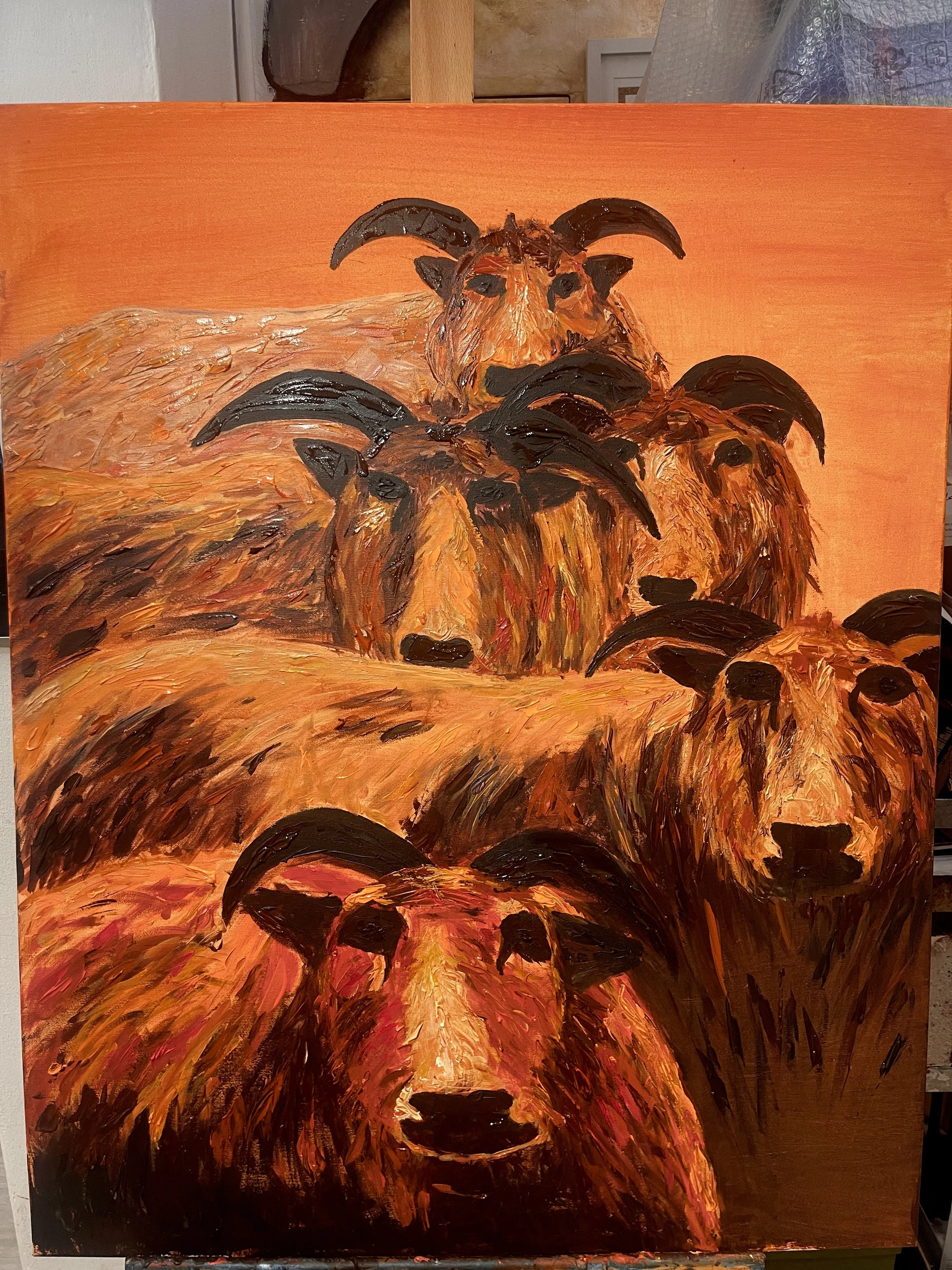 This was a monstrous task! A friend commissioned me to paint my blue sheep in orange. I was kind of done with sheep but wanted to make her happy. I didnt quite get the layout right so i had to add a 5th sheep which then became a joke of 'the sheep having made a baby overnight.'