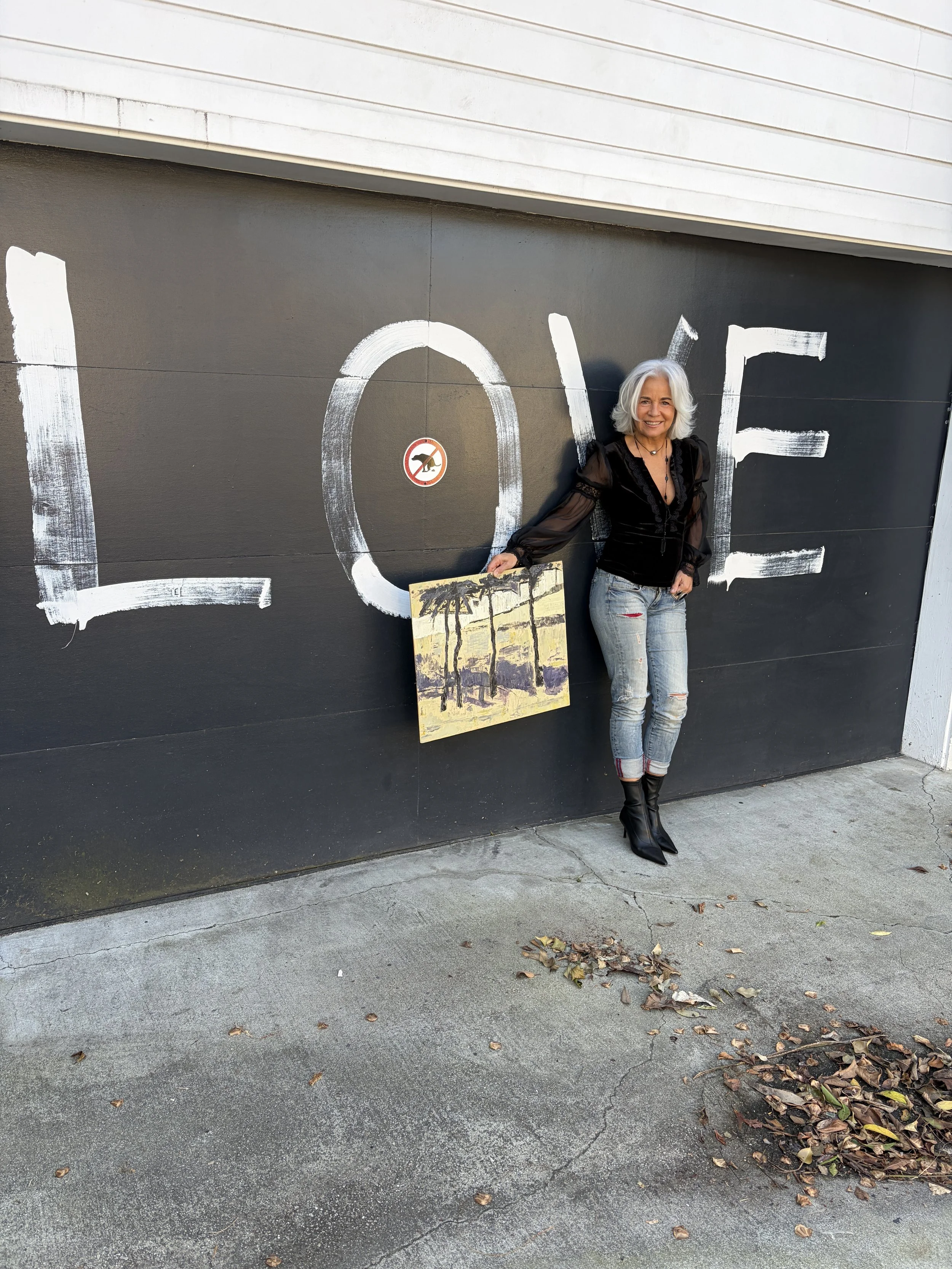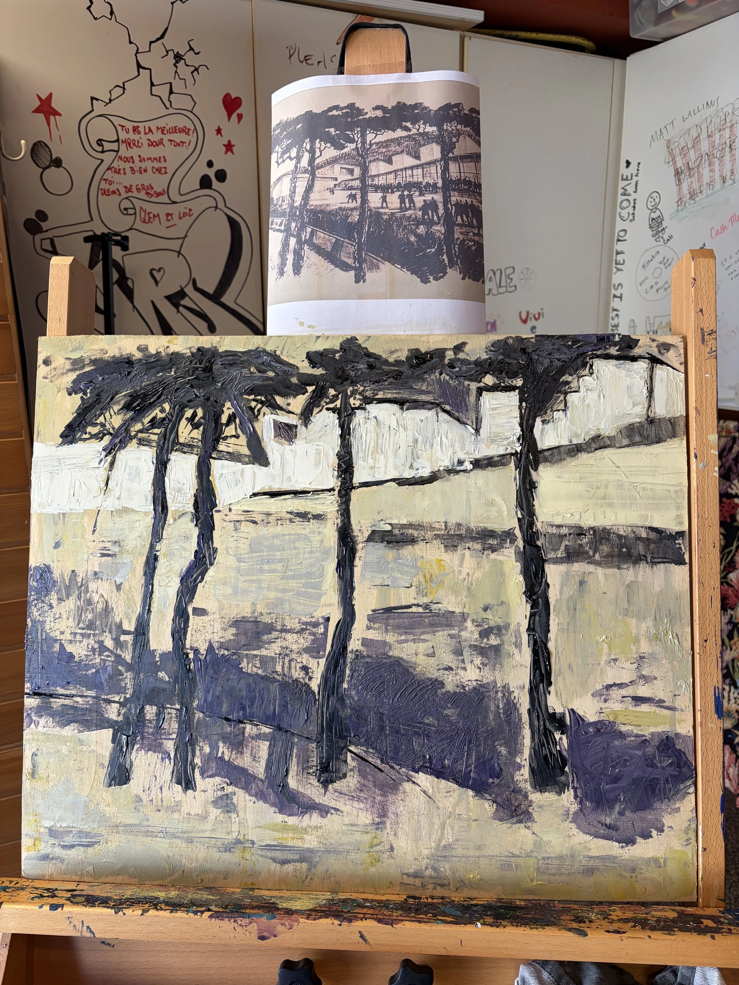 I feel inspired by trees. I painted on a large piece of finished wood, the marks of the tree showing through. This gave me the idea to follow those natural lines and create trees. The trunks are thickly layered strokes of paint with a spatula. They felt rigid so i took a steel brush and messed around with the tree tops. The effect was fabulous, you can feel the breeze moving the leaves and maybe fog rolling in.