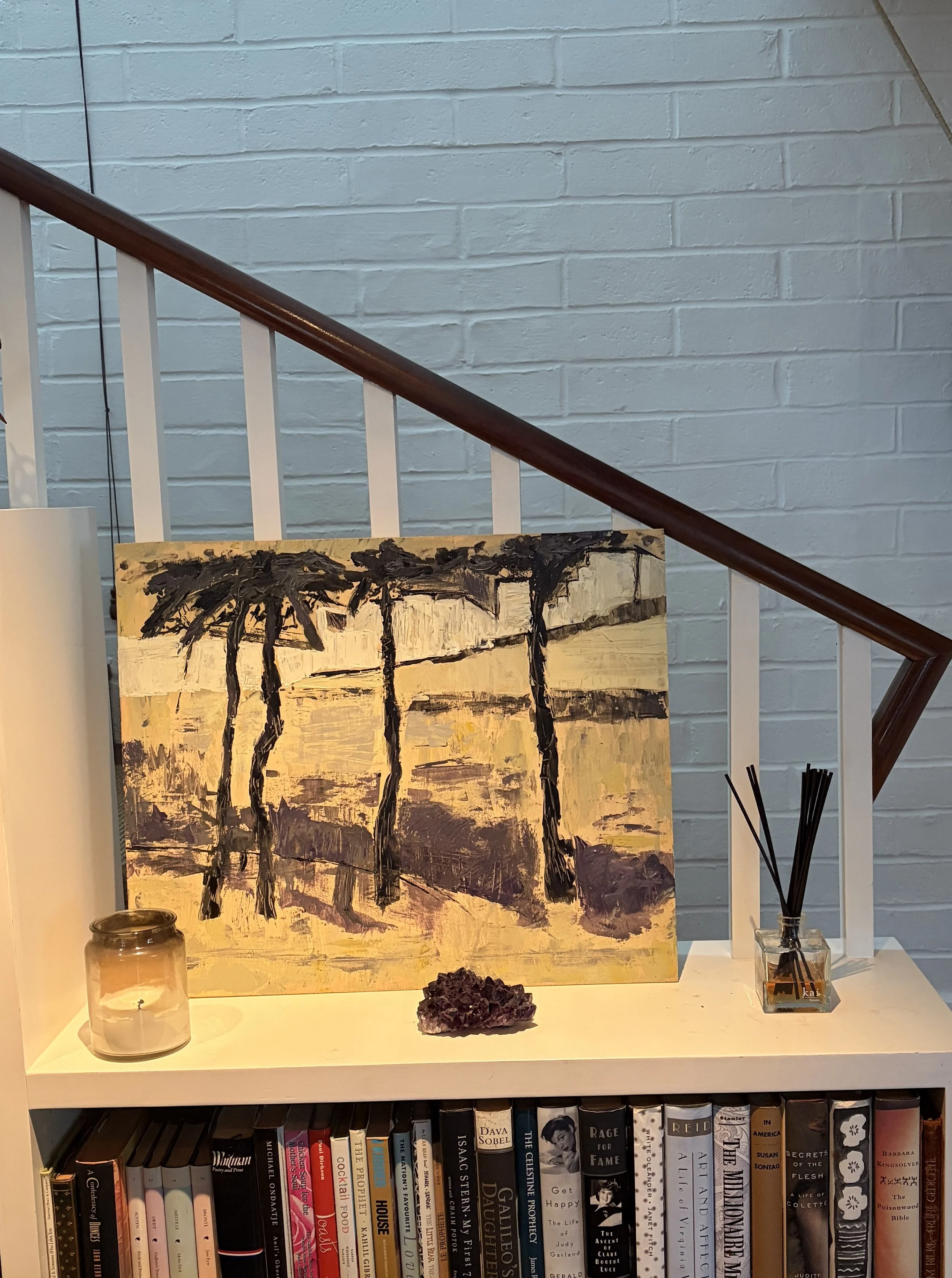 This was my first set of trees, also painted directly on wood. The antique painting inspired, but i wanted to give it an abstract spin. The squares represent the look of bark and the tress are thickly layered to also mimic bark.